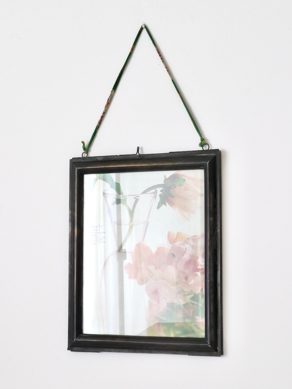 吊り下げ紐には、リユースされたインドの伝統衣装「サリー」の布が使われています。スタンドは付属していませんが、壁に立てかけるスタイルでも素敵に飾れます。