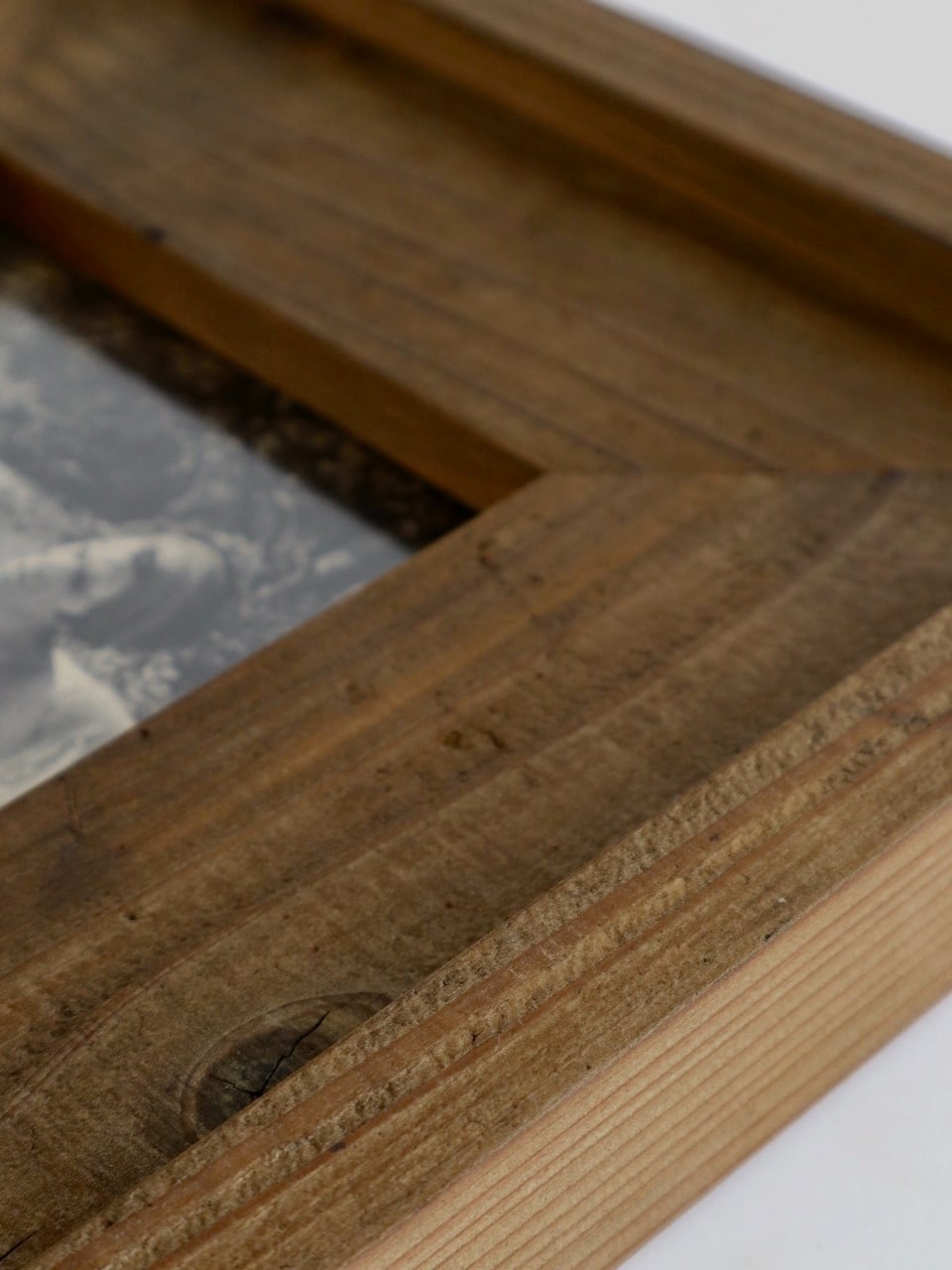 日本の工事現場で使われていた杉の足場板をクリーニングし、表面の汚れや釘を取り除いて再利用したフォトフレームです。
