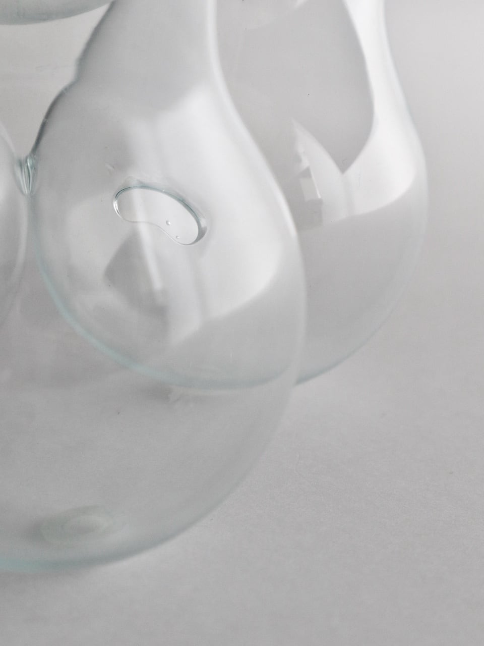 いくつもの小さなガラスフラスコが連なった、彫刻のような佇まいのフラワーベース。
