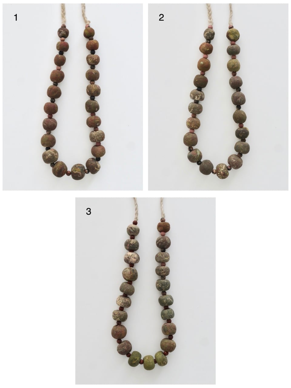約80年前に作られたクレイビーズが連なり、赤や緑が混ざり合ったマーブル模様の深い色合いが印象的です。