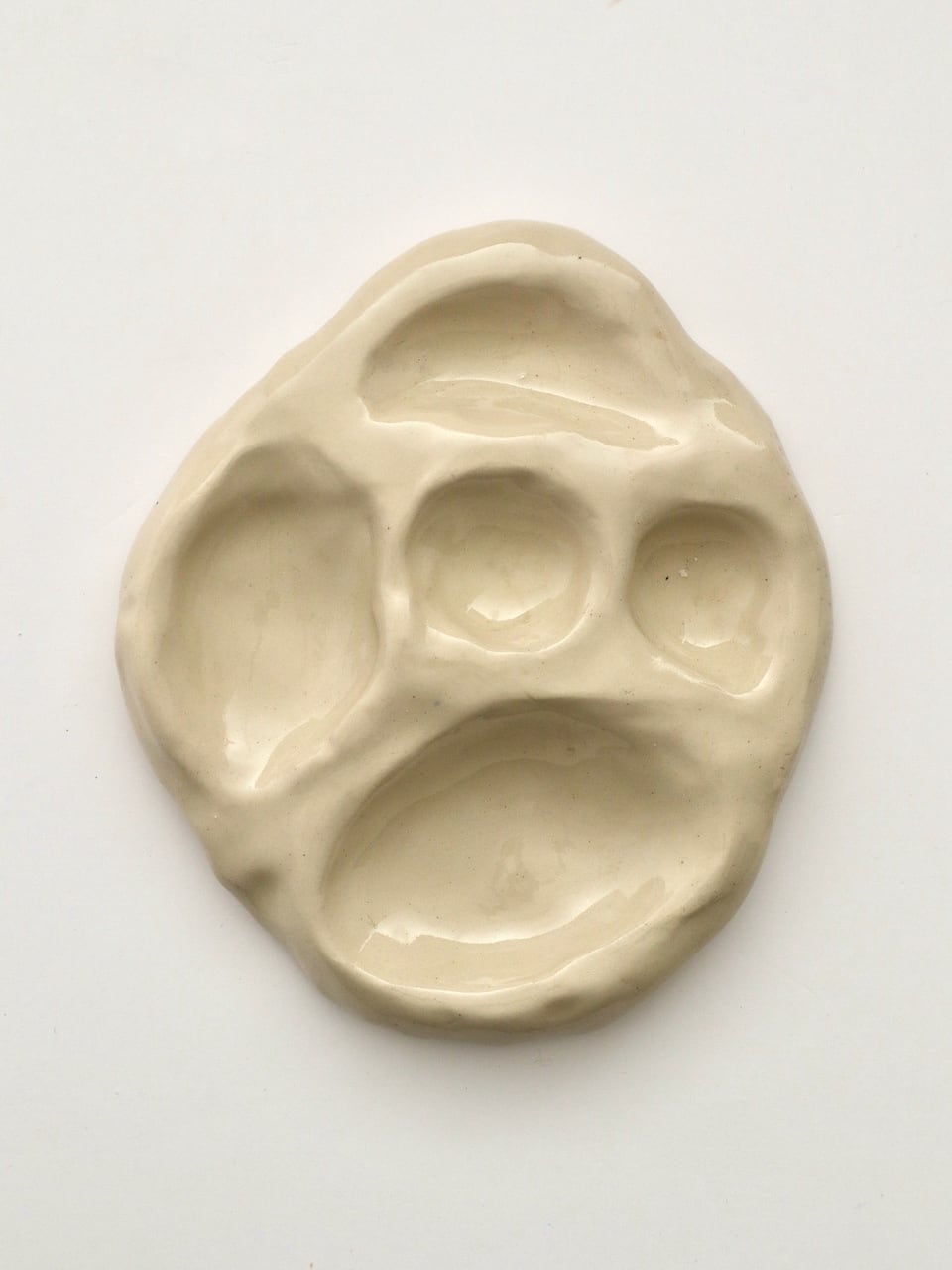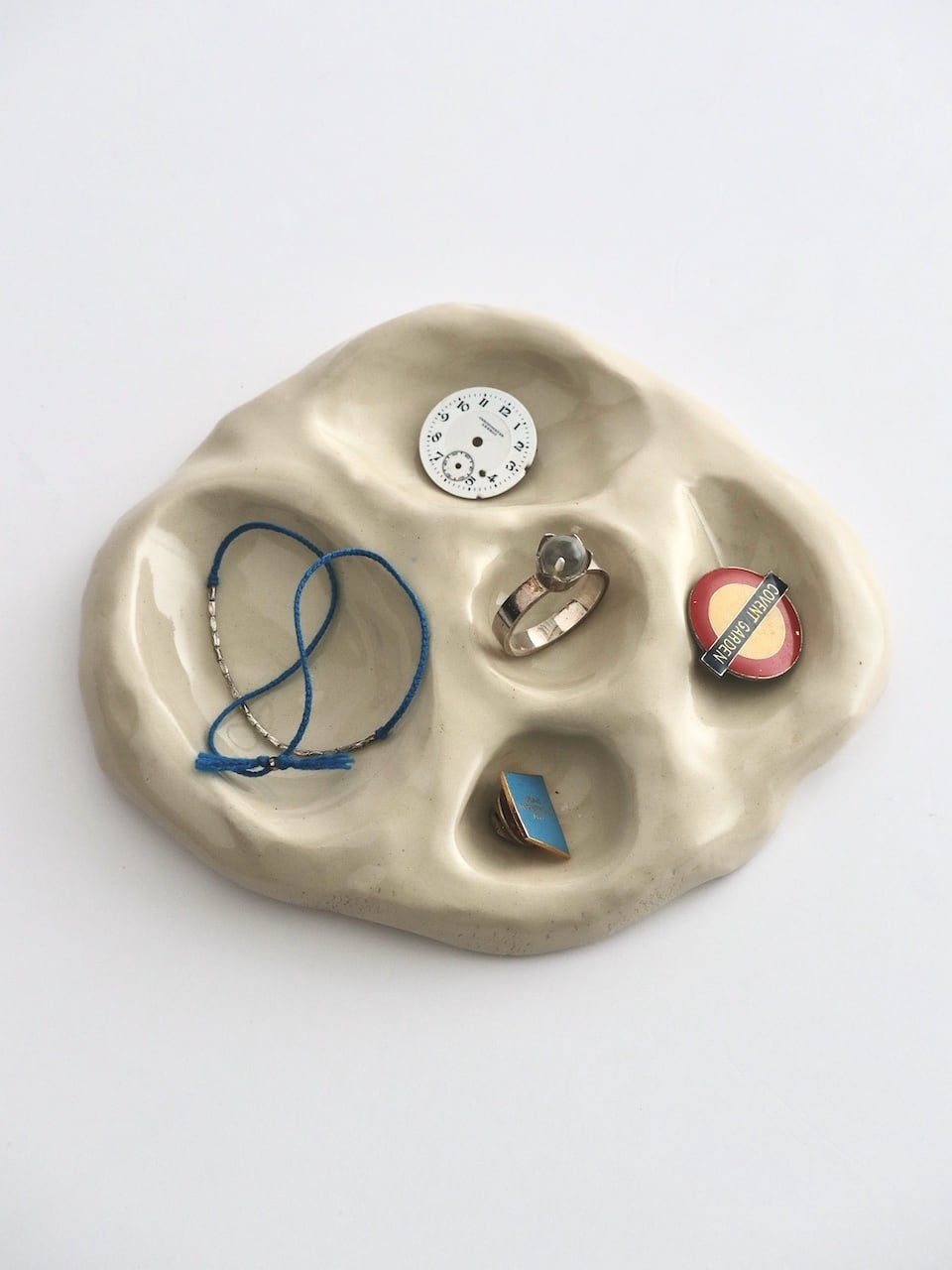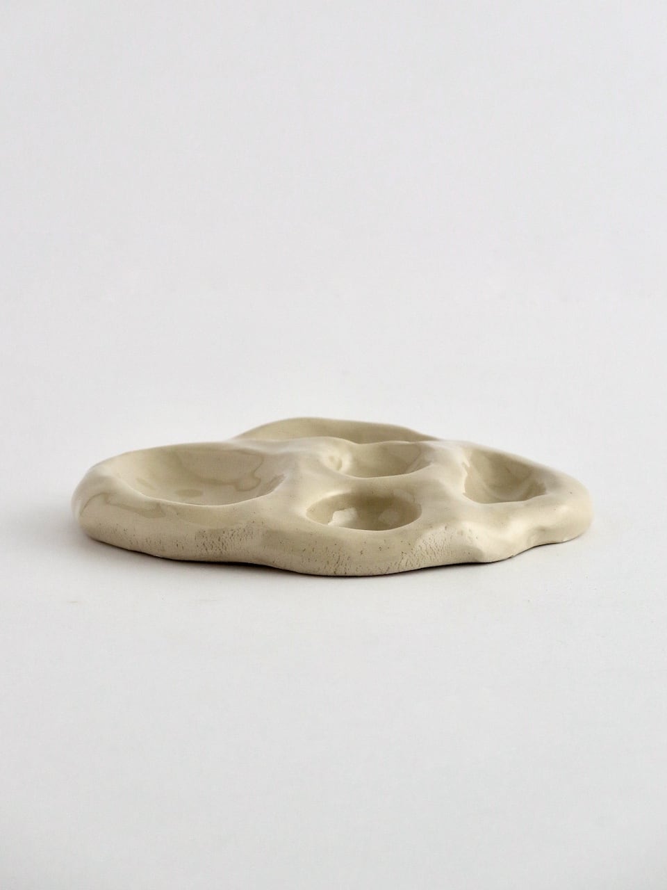 手作業で成形され、不規則な窪みを持つ有機的な形状が特徴です。