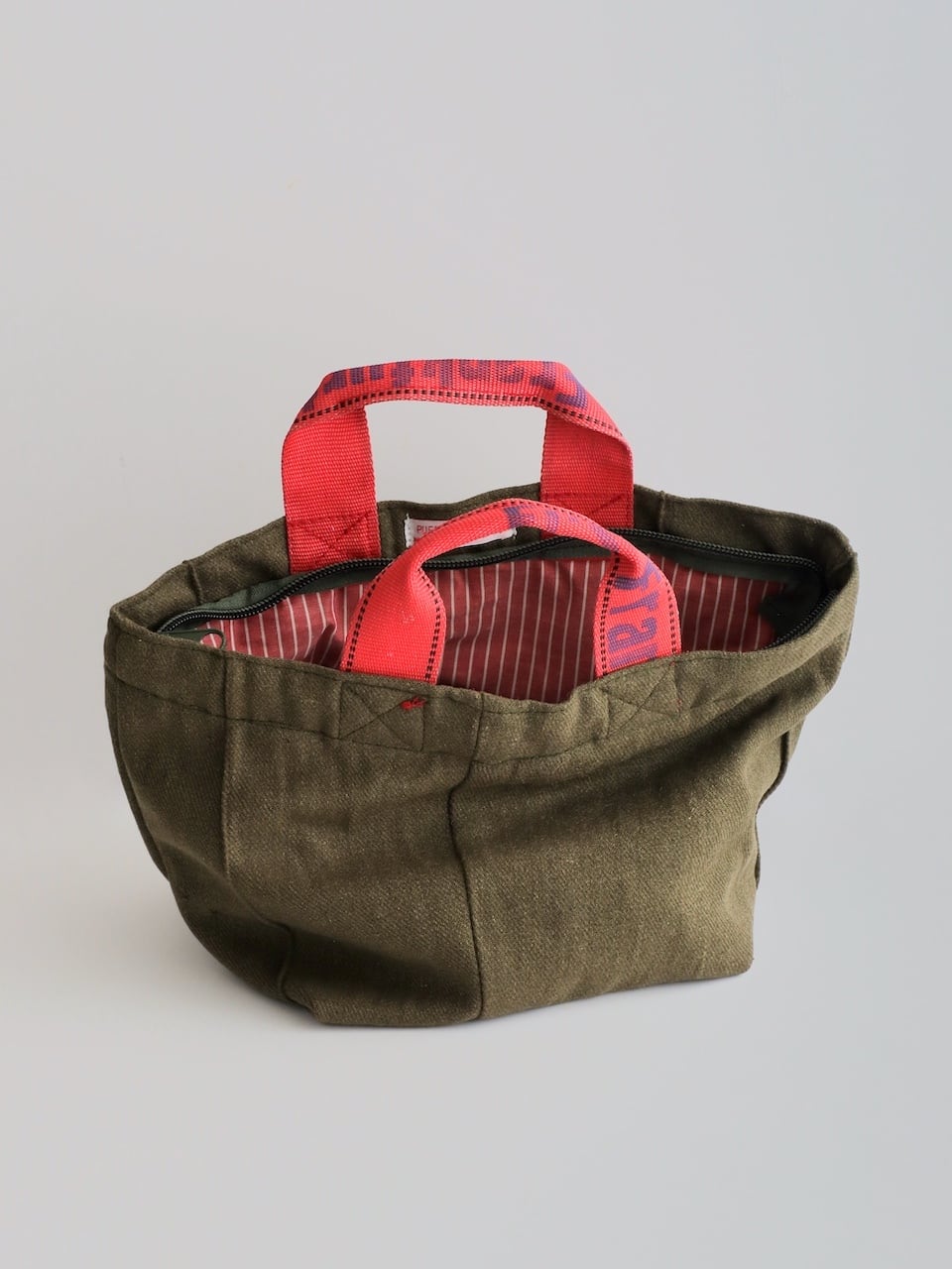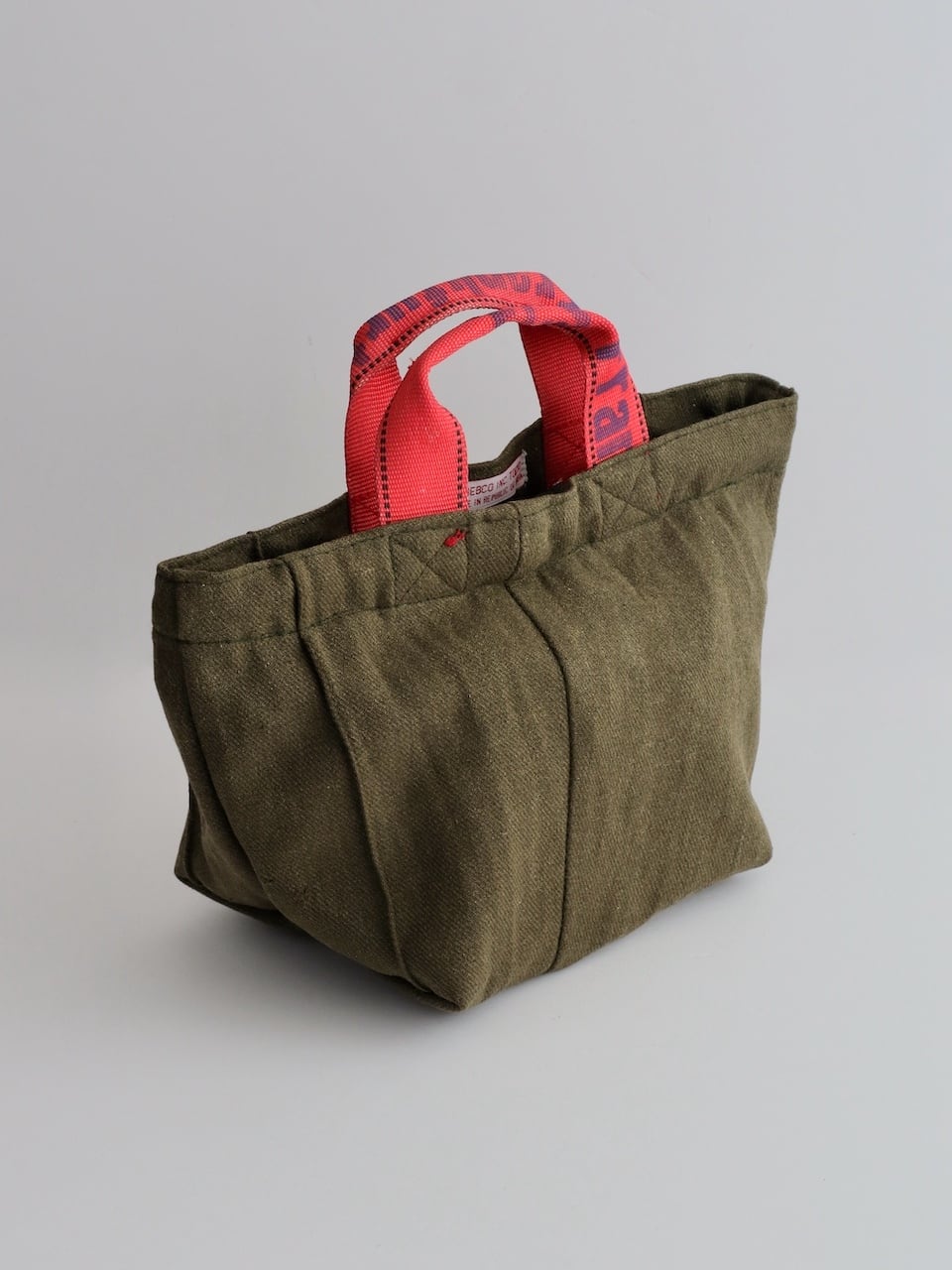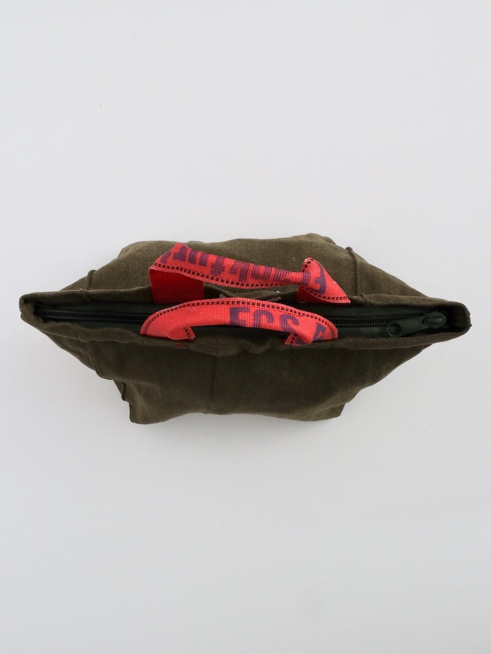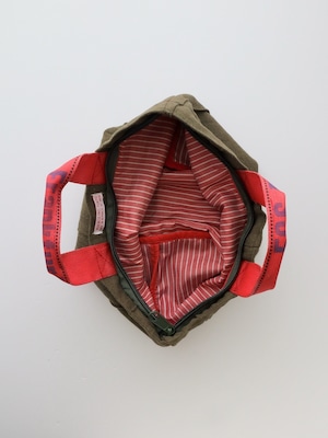 バッグ本体にはカーキ色のウール衣料を使用し、ハンドルにはエアカーゴで荷物を固定するために使われていたスリングベルトを再利用しています。