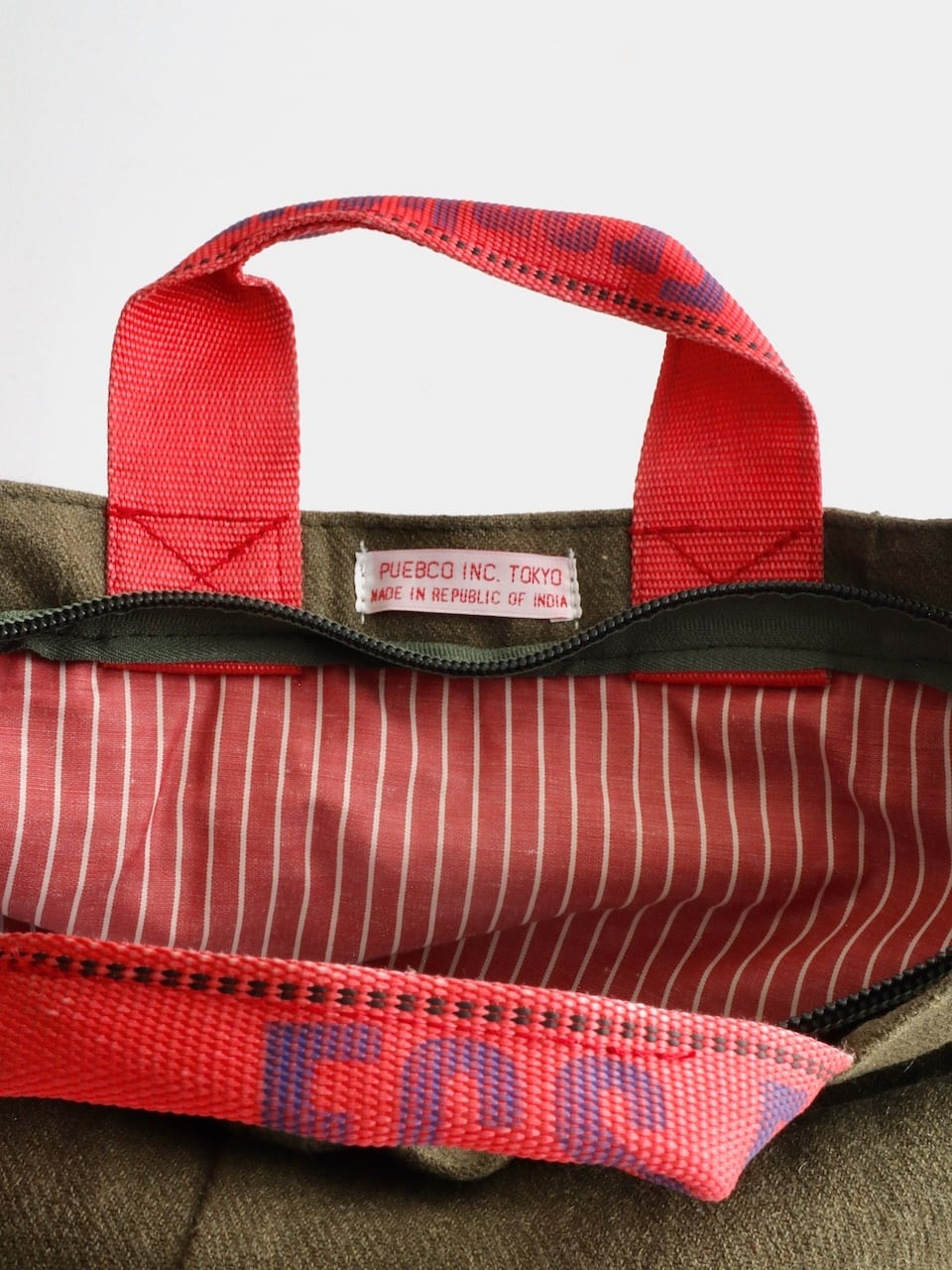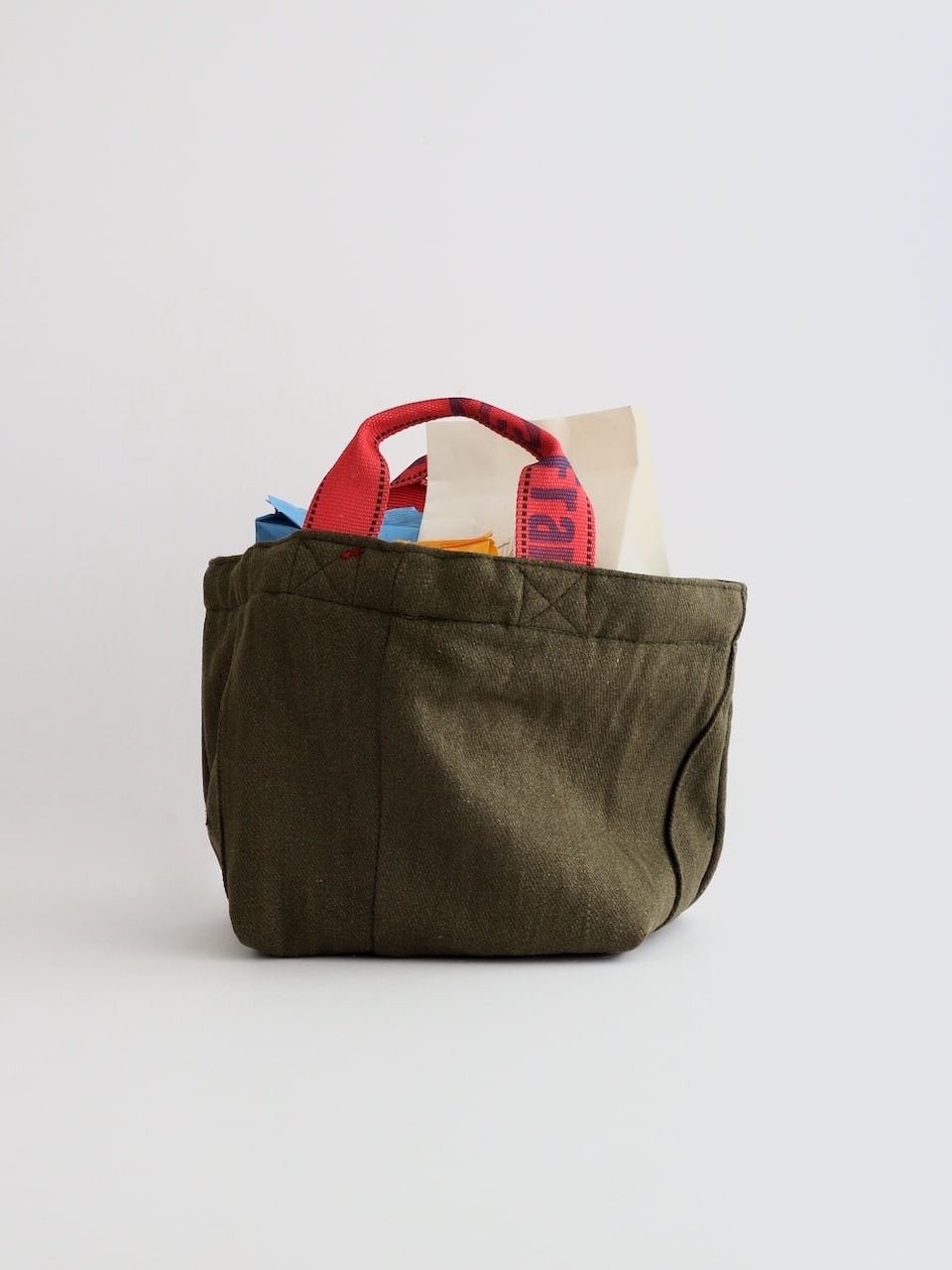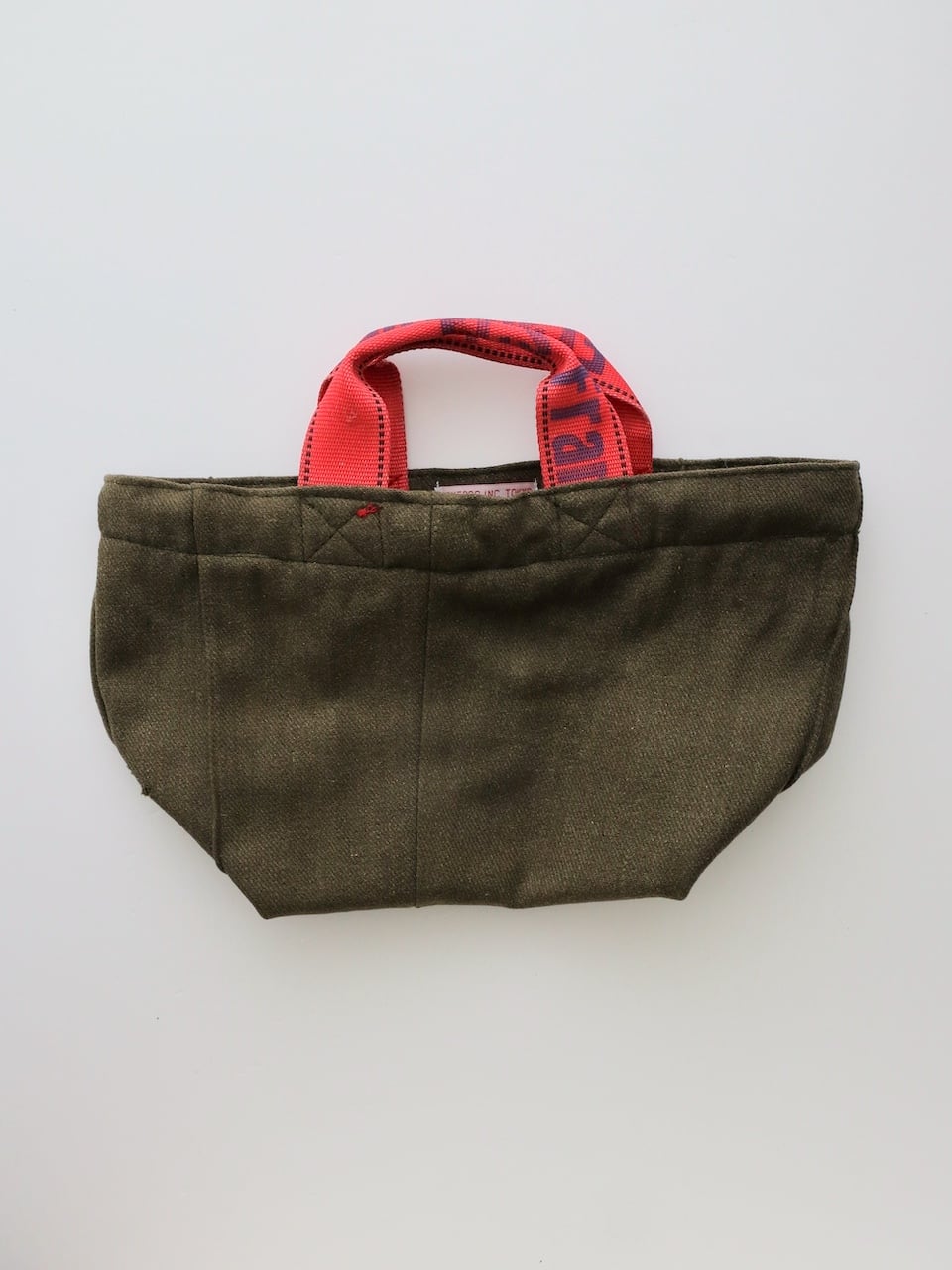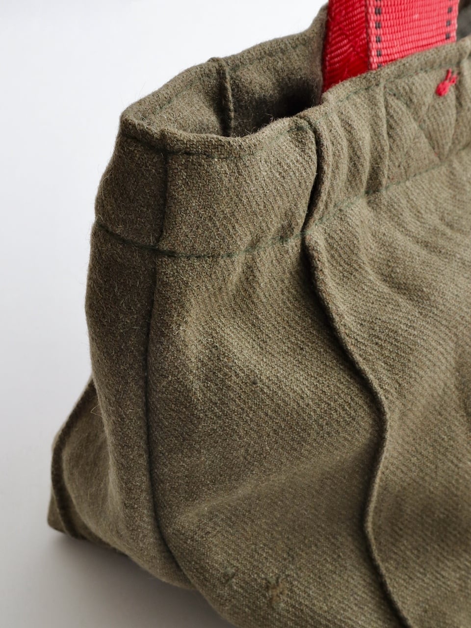 バッグ本体にはカーキ色のウール衣料を使用し、ハンドルにはエアカーゴで荷物を固定するために使われていたスリングベルトを再利用しています。