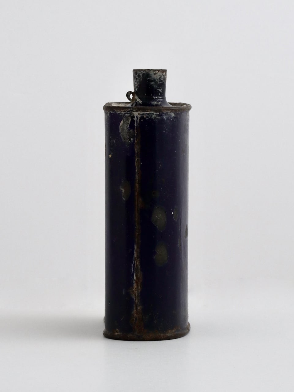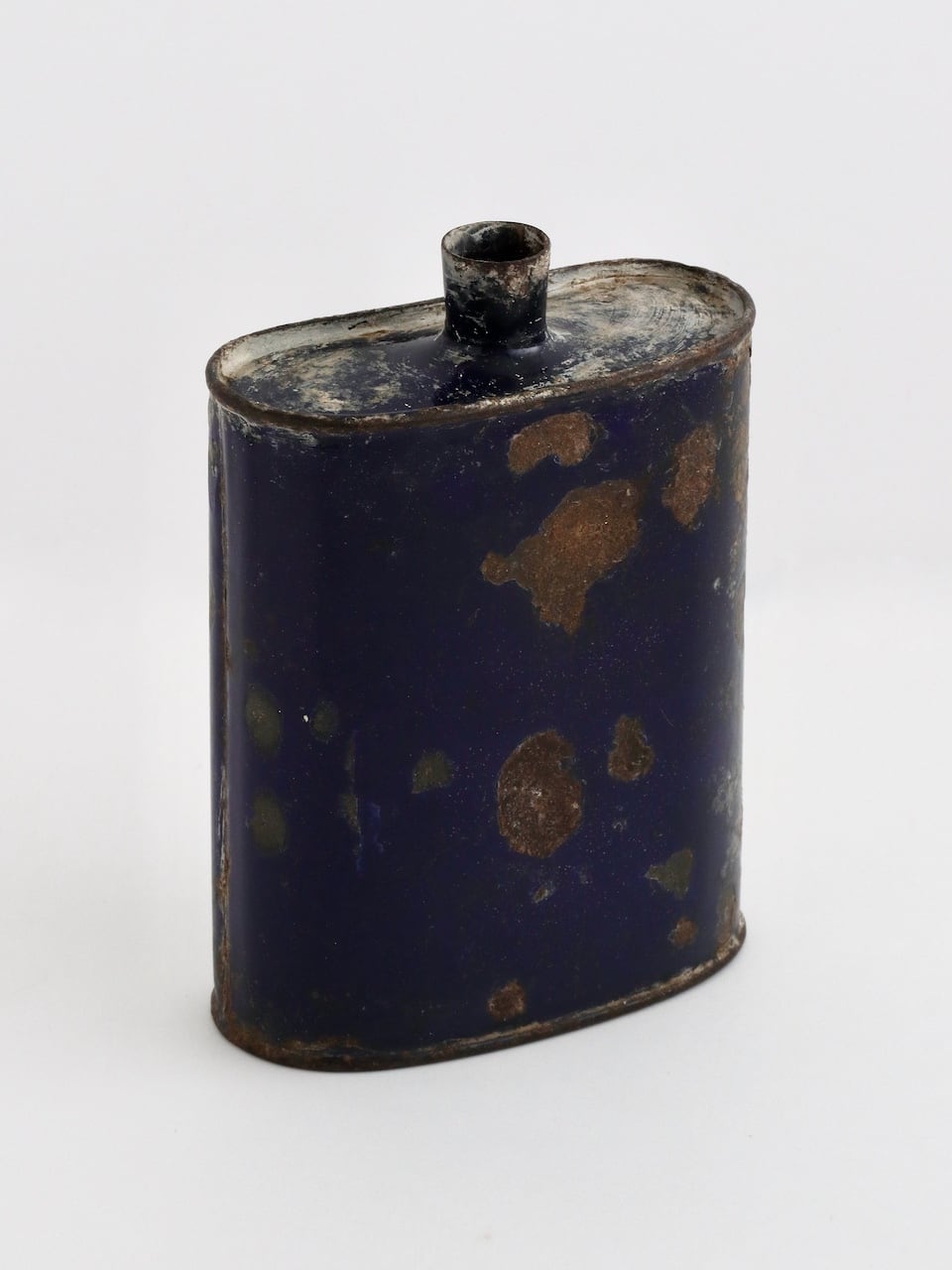 上から見るとジェリービーンズのような丸みを帯びたフォルムが特徴的で、一般的なスキットルよりもかなり大きなサイズ感。表面はコバルトブルーのエナメル塗装で、経年による剥がれや錆が味わいを深めています。インダストリアルな雰囲気のディスプレイや、空間のアクセントとしてもおすすめです。