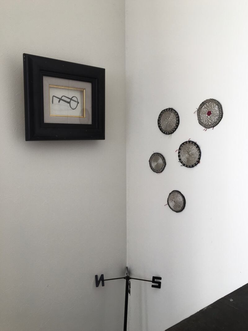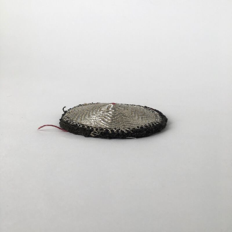 グレーの生地に、銀色の糸をグルグルと巻いて円が作られています。