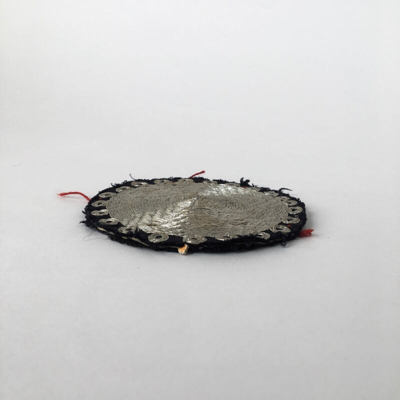 濃紺の生地に、銀色の糸をグルグルと巻いて円が作られています。