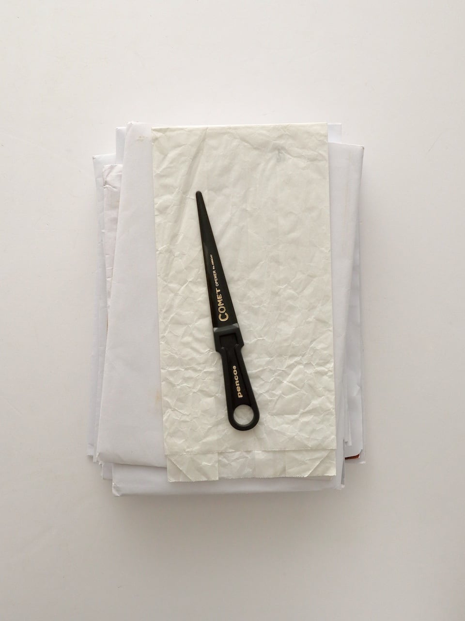 最後はナイフを封筒に対して垂直に立て、角までゆっくり押し切ります。