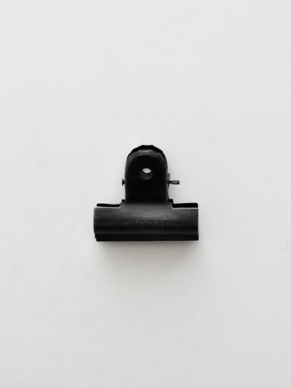 黒い鉄の質感がインダストリアルな雰囲気を演出します。書類や写真の整理はもちろん、食品袋の口を留めたり、ちょっとした収納にも便利。つまみ部分の穴を使えば、ピンに掛けて吊るすこともできます。シンプルながら無骨で存在感のあるステーショナリーです。