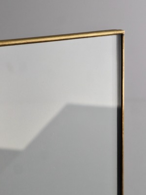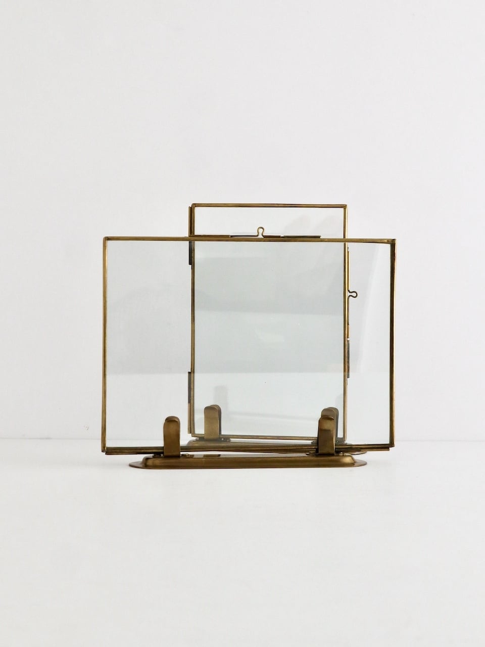 フレームは細い真鍮で縁取られた2枚のガラスを蝶番で留めたつくり。