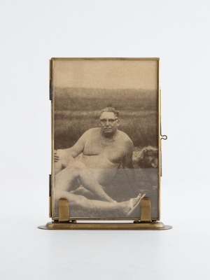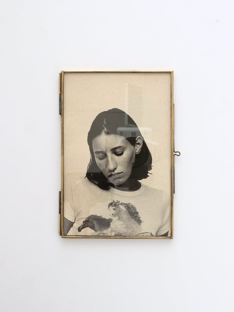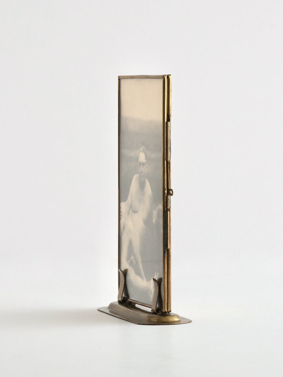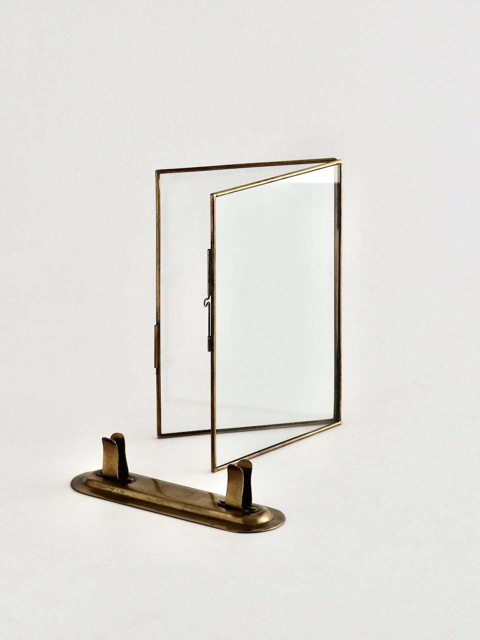 フレームは細い真鍮で縁取られた2枚のガラスを蝶番で留めたつくり。