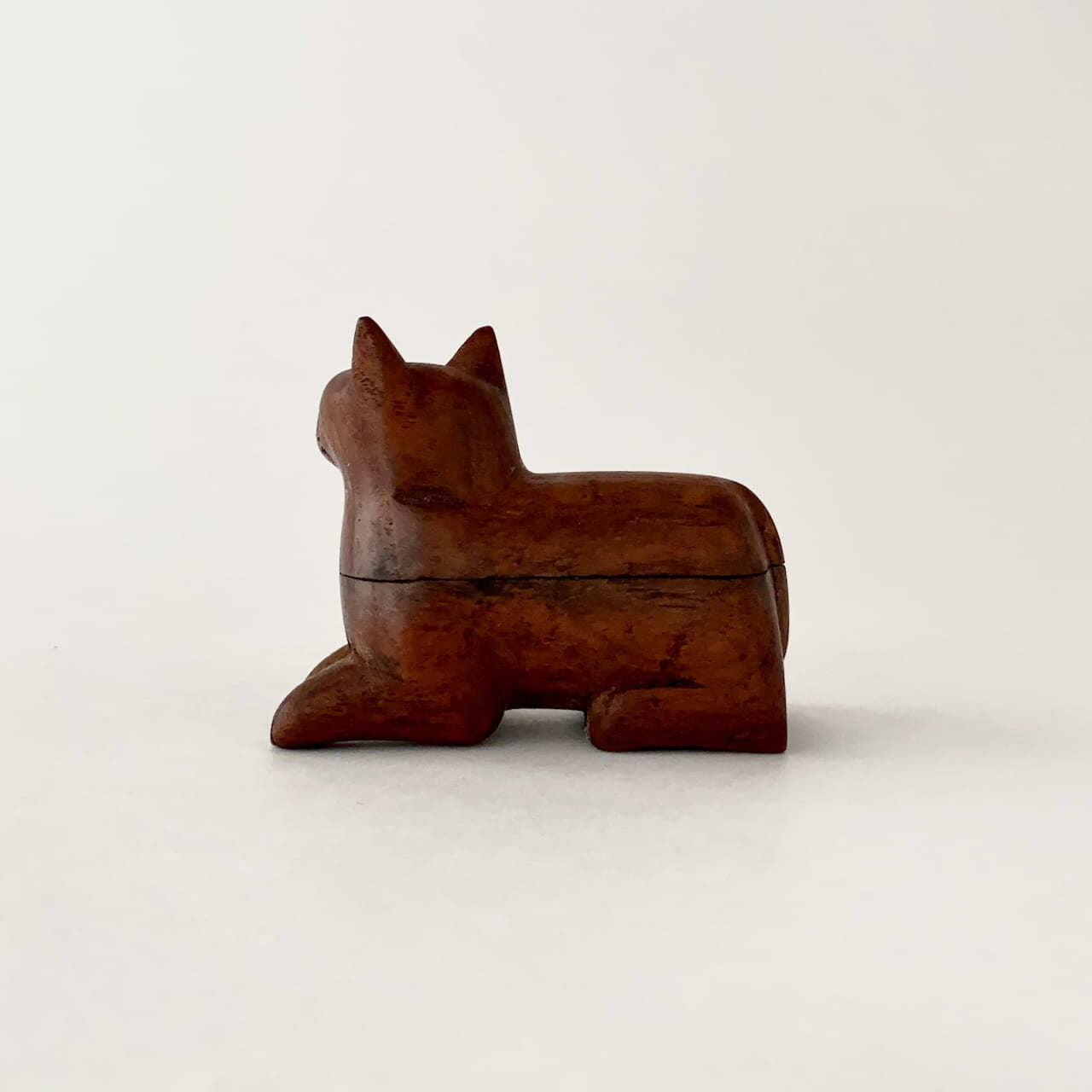 猫が座っている形のアクセサリーボックスです。60~70年前にタイの古都「スコータイ」で作られました。ニスで仕上げられた自然な木の色。手のひらに乗るくらいのサイズで、軽く滑らかな質感です。
