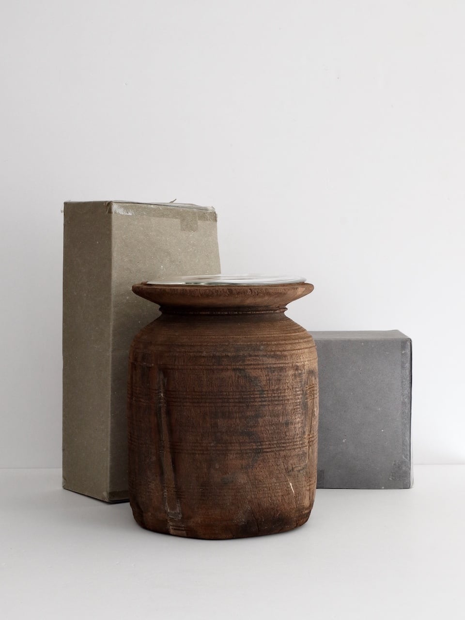 インドでスパイスなどを入れるために使われていた古い木製のポットを花器に仕立てました。ポットの形に合わせて、ガラスシリンダーを一点一点手作りしています。